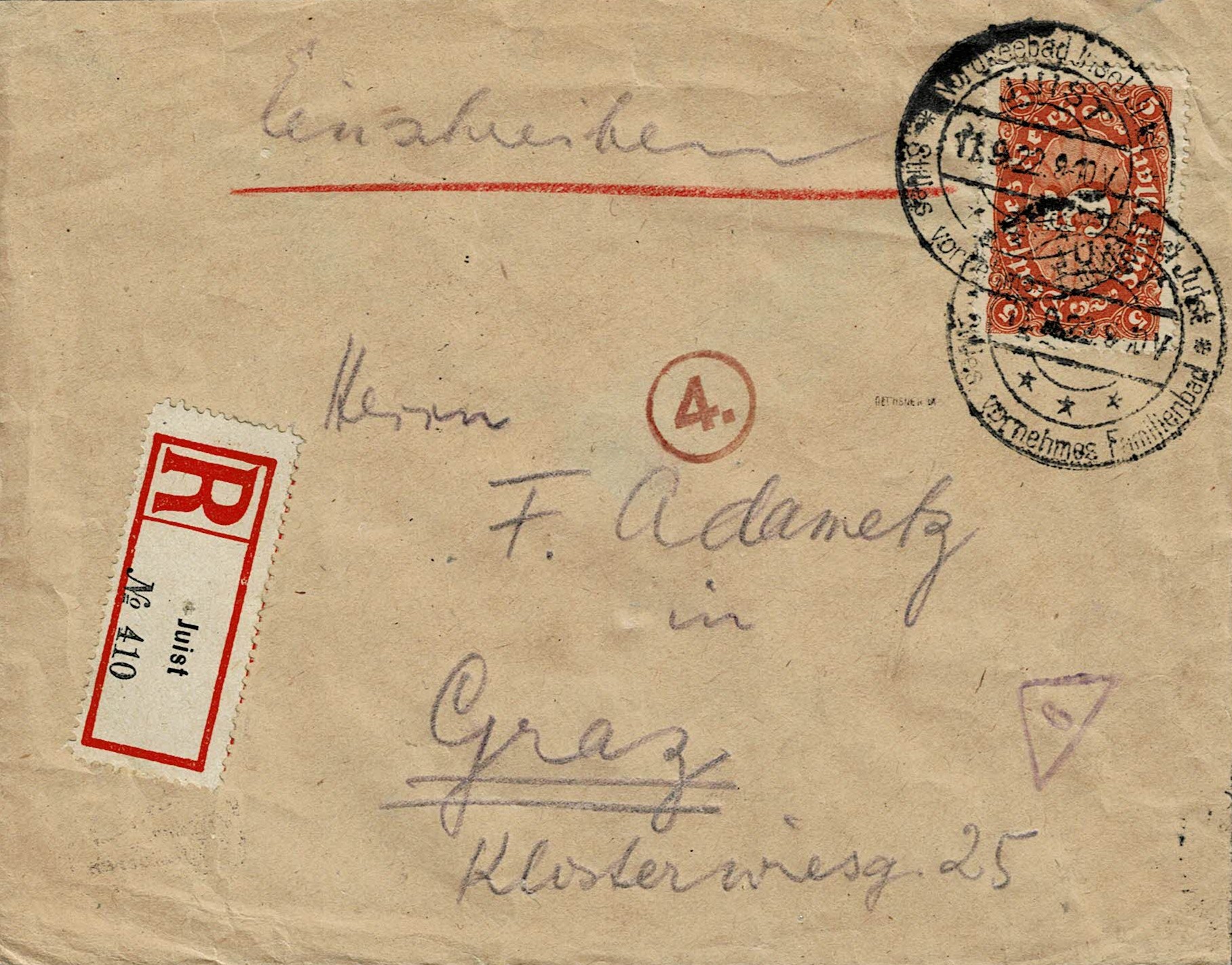 ein Beispiel Einschreibebrief mit R-Zettel Juist, Poststempel vom 11. September 1922 (vornehmes Familienbad), nach Graz