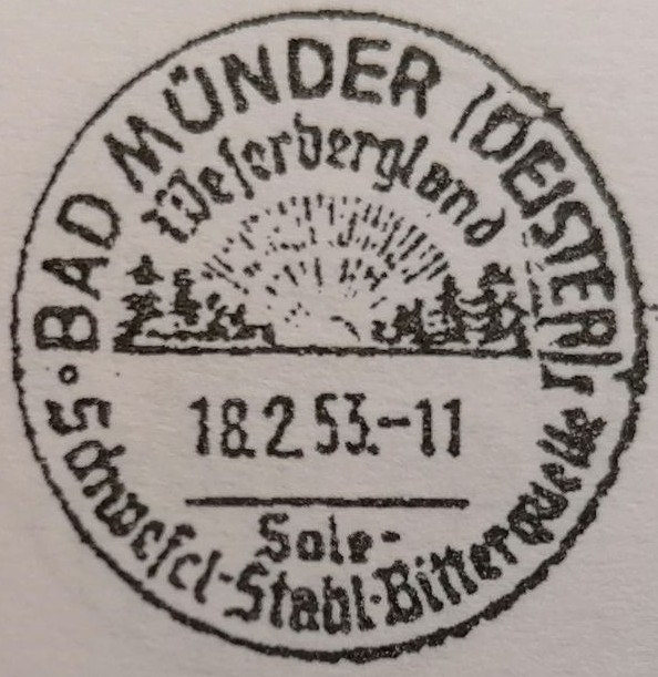 Der Ortswerbestempel ist bereits ab 1942 (belegt) und mindestens bis 1957 im Einsatz. Zur Bildbeschreibung gehört eine Nadelwaldschneise mit aufgehender, strahlenumkränzter Sonne und dem Text Weserbergland – Sole -Schwefel – Stahl – Bitterquelle.