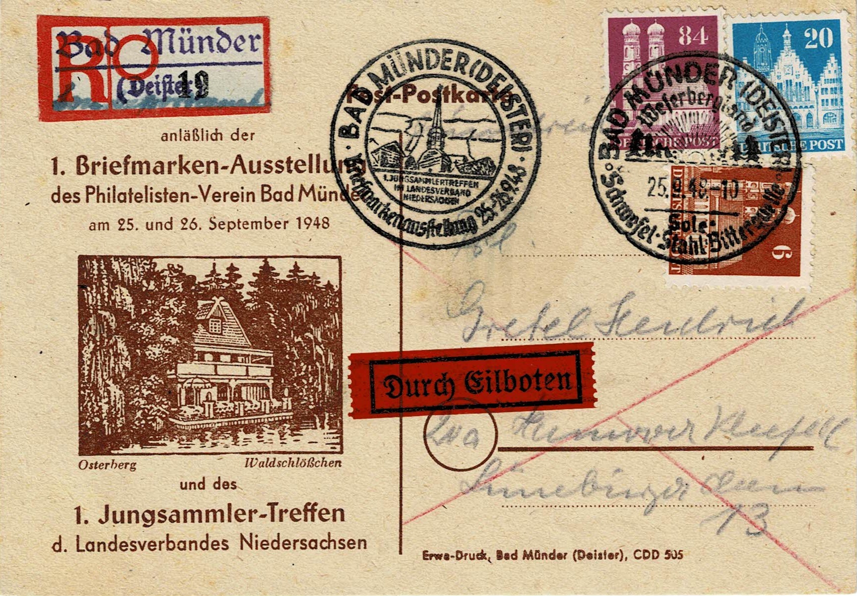 An zwei Tagen, am 25. und am 26. September 1948, trafen sich Sammler anlässlich der 1. Briefmarken-Ausstellung des Philatelisten-Verein in Bad Münder. Angeschlossen war das 1. Jungsammler-Treffen des Landesverbandes Niedersachsen.