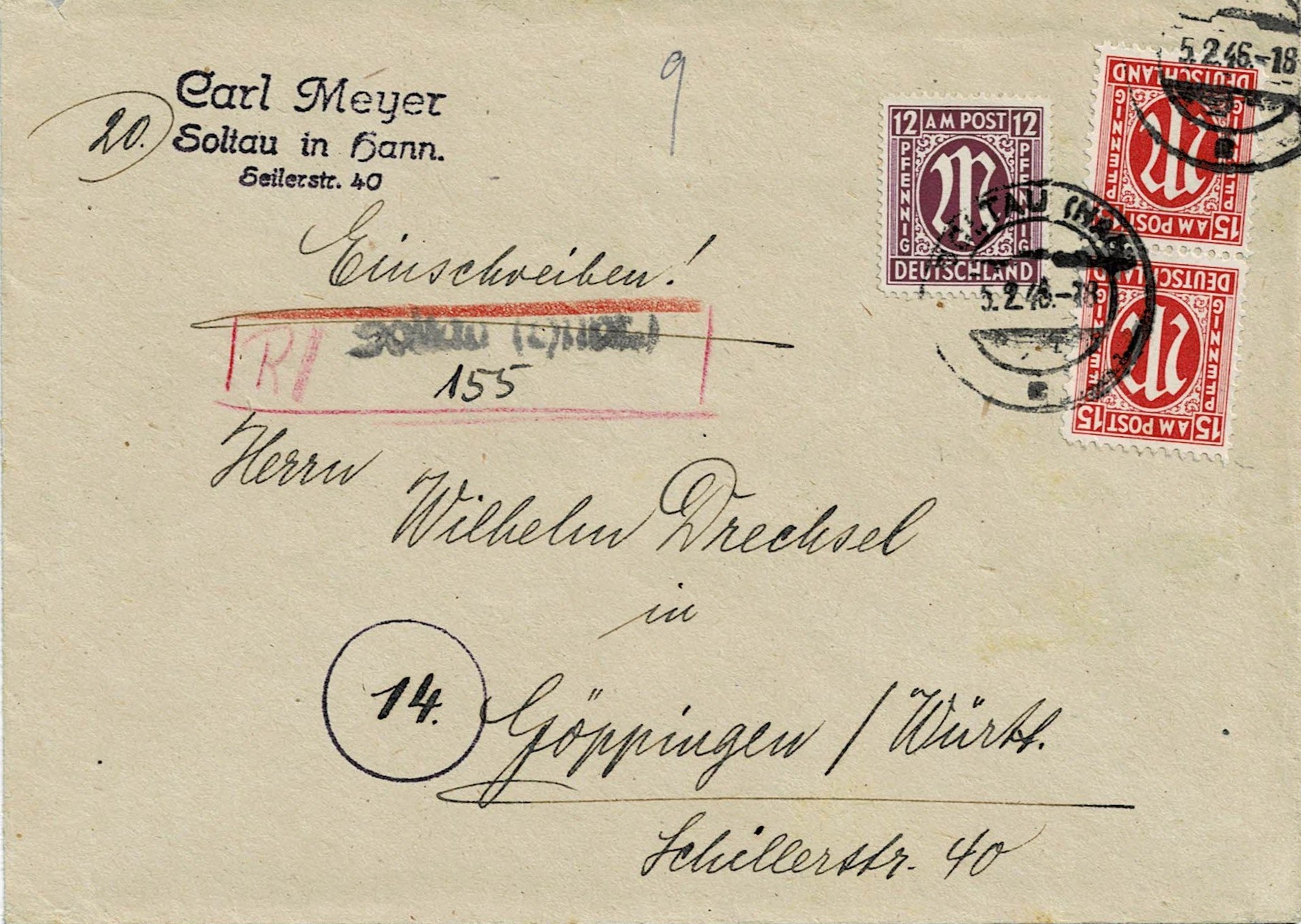R-Brief aus Soltau (Han) nach 14 Göppingen. Handschriftlicher R-Vermerk, rotes R, rot gemalter Kasten, Ortsbezeichnung mit Stempel und Numerator handschriftlich ergänzt. Poststempel vom 5. Februar 1946.