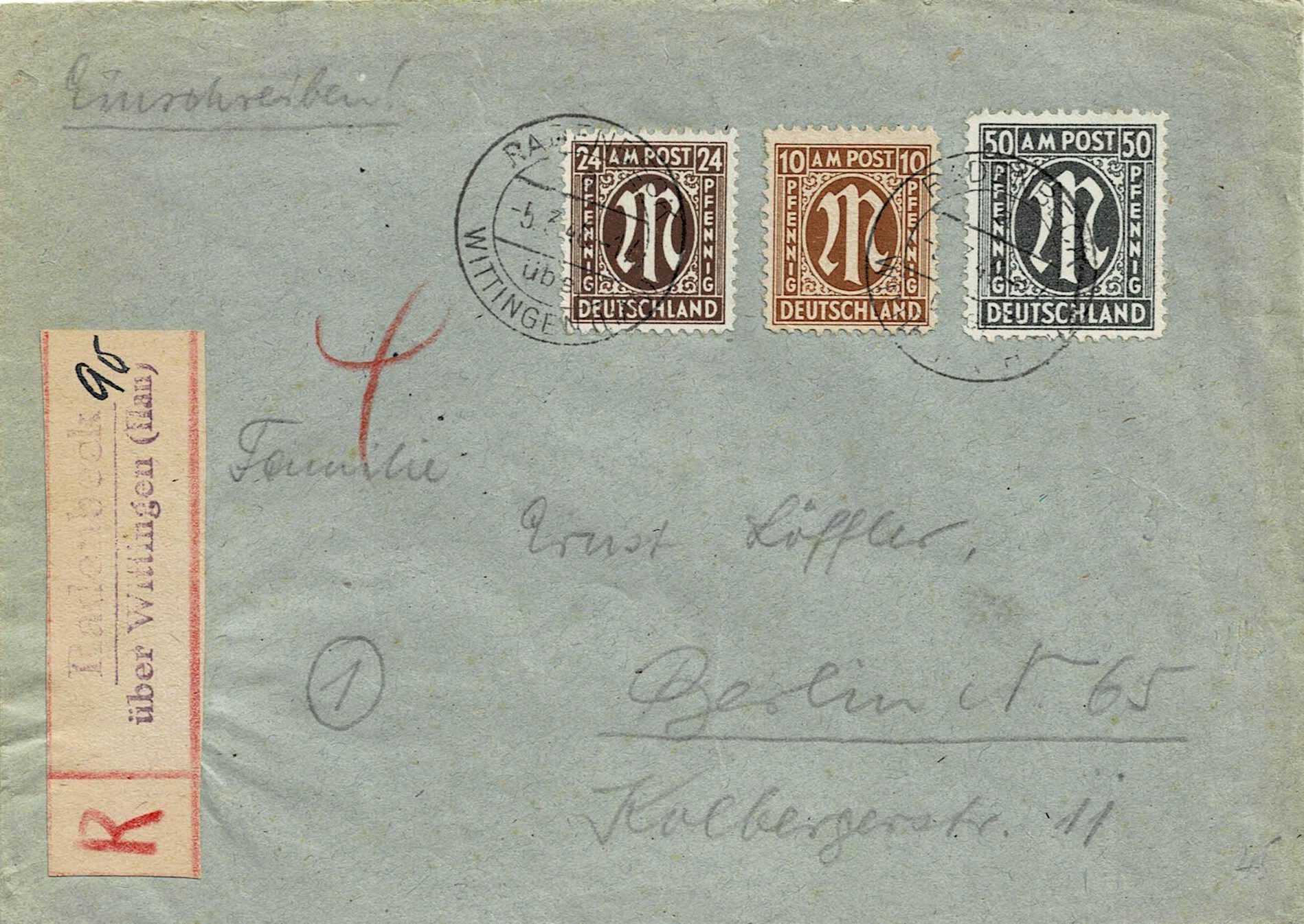 R-Brief aus Radenbeck über Wittingen (Han) nach Berlin. Selbstgefertigter R-Zettel aus Papier, roter Rahmen, rotes R. Numerator handschriftlich in blau ergänzt. Ortsbezeichnung mit Stempel in blauer Farbe. Selbstgefertigter R-Zettel aufgeklebt auf Umschlag. Poststempel vom 5. März 1946.