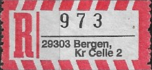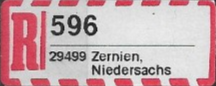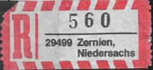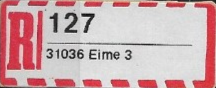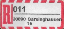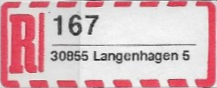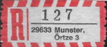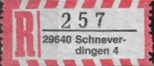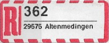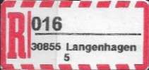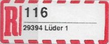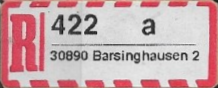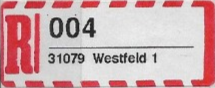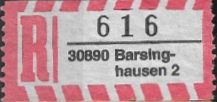 R-Zettel nass- und selbstklebend mit einem oder zwei Unterscheidungsbuchstaben mit postamtlichen Zusatzeindruck ohne Postbank, Postscheckamt und Postgiroamt unterhalb des Ortsnamens mit fortlaufender Nummerierung von der Rolle (S. 37, 38)