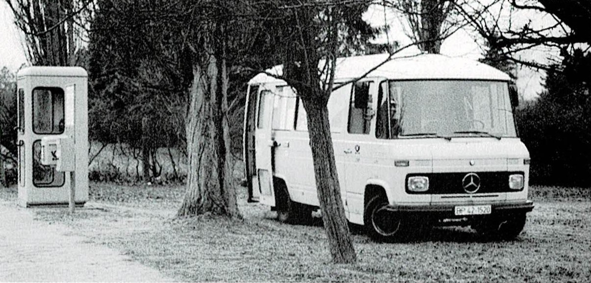 Fahrbarer Postschalter in Aktion: am Haltepunkt Altenoythe mit Telefonzelle, Briefkasten und Postwertzeichenautomat